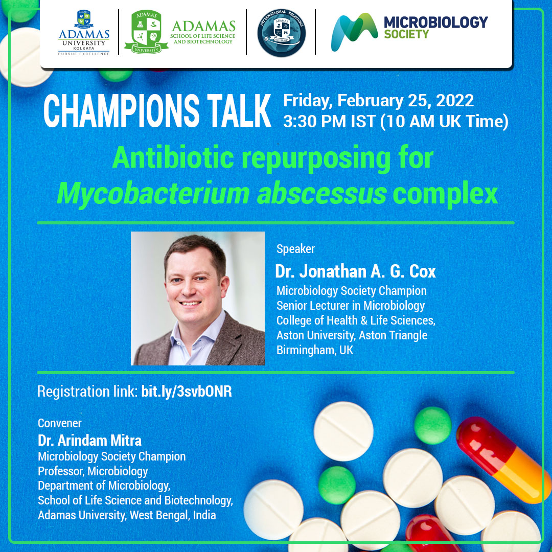 | 25 February 2022 | Champions Talk: Antibiotic repurposing for Mycobacterium abscessus complex | Zoom event | Arindam Mitra and Jonathan Cox |